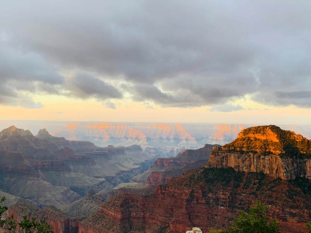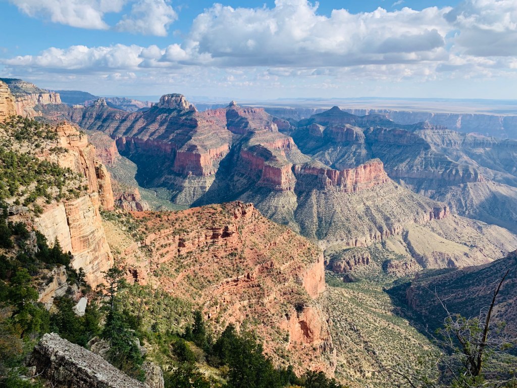 Day 6 (North Rim Grand Canyon): Went to lodge to watch sunrise and drink coffee, go back to take down tent, pack up car. Left campground around 7 AM to hike for 5-6 hours. Campers have access to Transept Trail (unpaved trail that travels along the rim to visitor center & lodge) & Bridle Trail (cuts through the forest & connects with the North Kaibab Trail). The North Kaibab Trail descends into the Inner Canyon & is a short walk from the campground. We did not do these trails though, we drove a half hour and went to Cape Final, and Cape Royal which had amazing vistas over the Grand Canyon and were easy hikes (~7 miles in total). Left ~2pm for 5 hr drive back to Vegas to return car & relax, Stay in Vegas on strip, Dinner and a show before flying out on Wednesday morning.