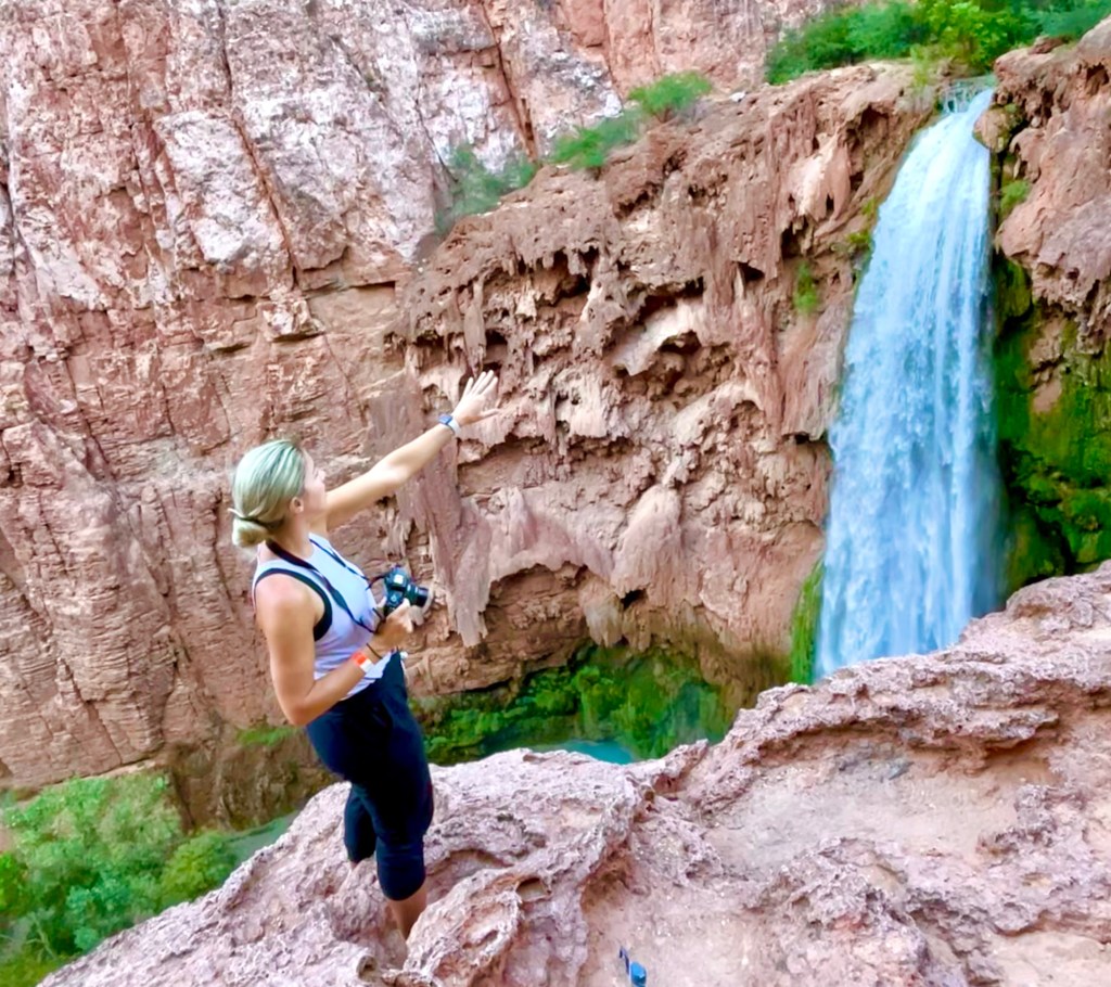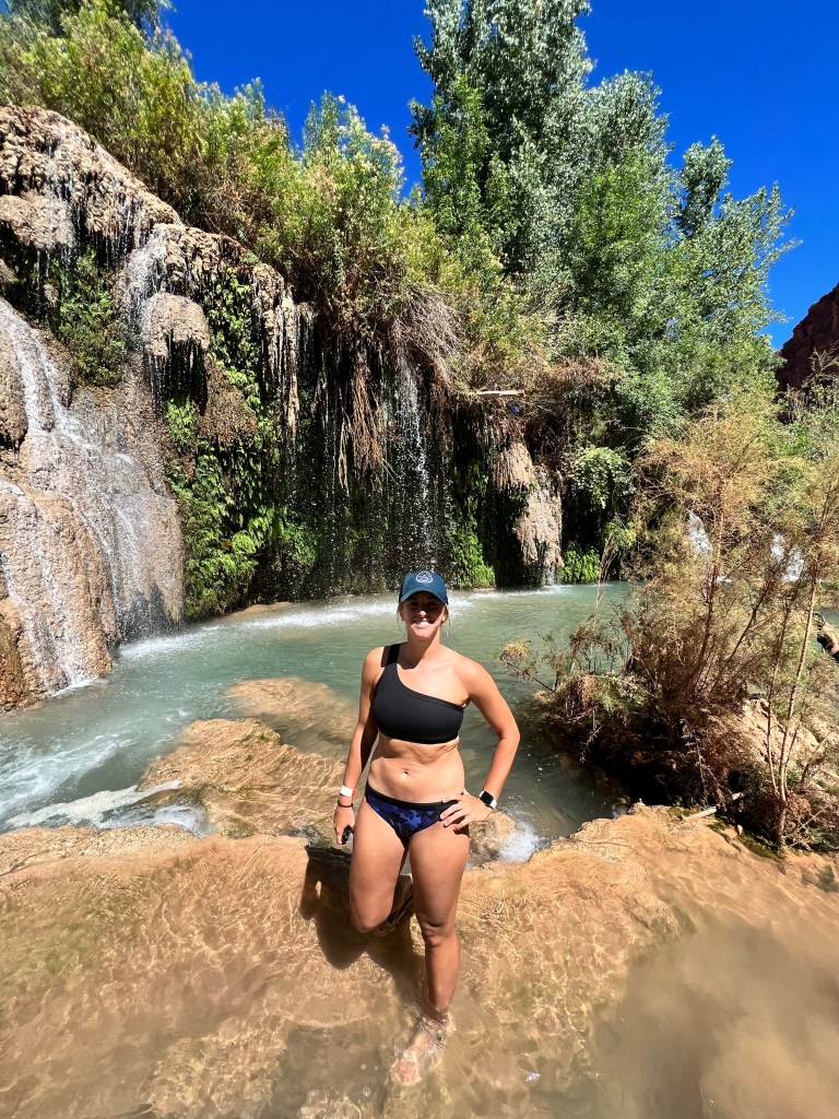 We set up our tents and got our campsite situated with things like hanging our food in rat sacks before headed to the base of Havasu Falls the rest of the day to take photos and take in the views of that magical teal water! The temperature of all the water is about 70 year-round but it was 100 degrees the week we went so it was refreshing! Definitely cool at first but we acclimated after a few minutes. We loved sitting in the little pools that are created from the power of the waterfall at the base of Havasu. The cold water was a godsend all week, replenishing our worked muscles!