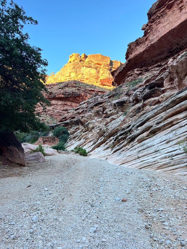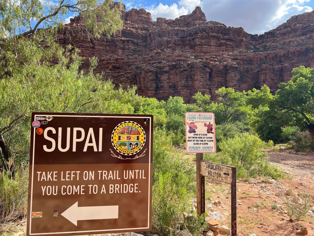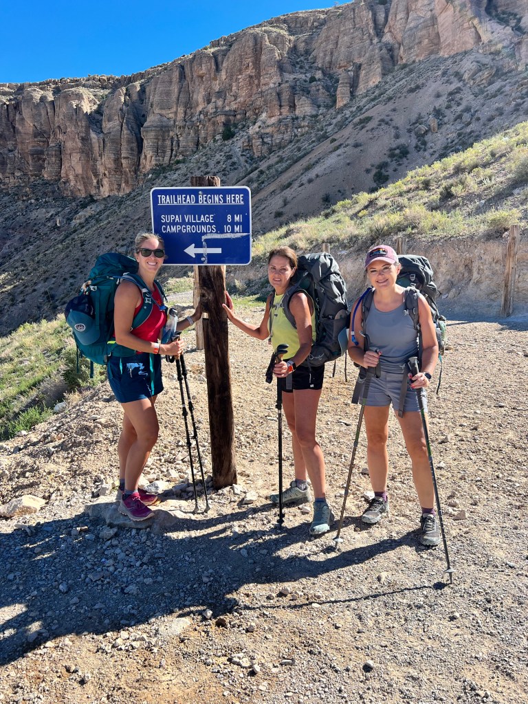 Our adventure began with the 65 mile drive to the hilltop where the trailhead was located. Our hotel was the closest to the trailhead so an early morning drive on the 65 mile stretch is inevitable. It is also an open range road making navigating the elk and cattle that much more exciting in the darkness! We finally made it to the hilltop and found a parking spot (pro tip: don’t park along rock wall, you may return to a broken windshield!). We started the 10 mile descent into the Grand Canyon at 5 am heading toward the small village of Supai, the gateway to Havasu Falls. The hike in was a challenging but rewarding journey through stunning canyons. Along the way, we encountered incredible vistas and took in the unique beauty all around us. The colors of the canyon walls were changing with every movement of the sun.