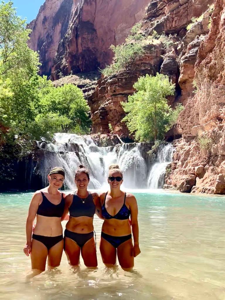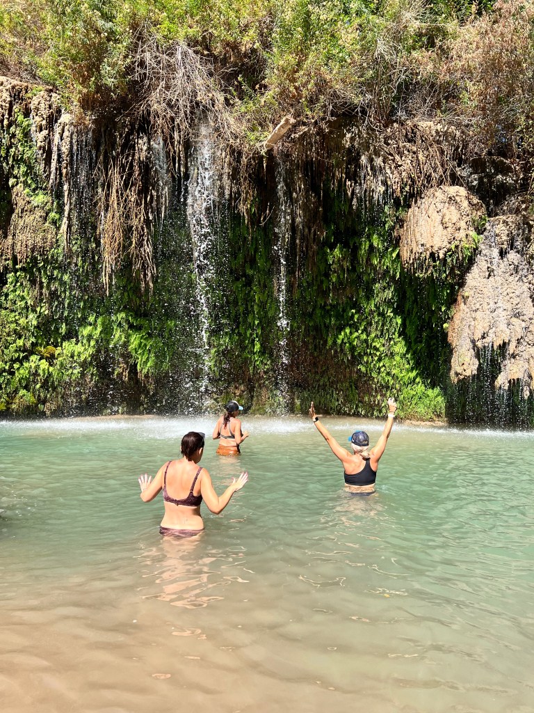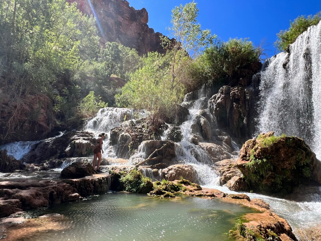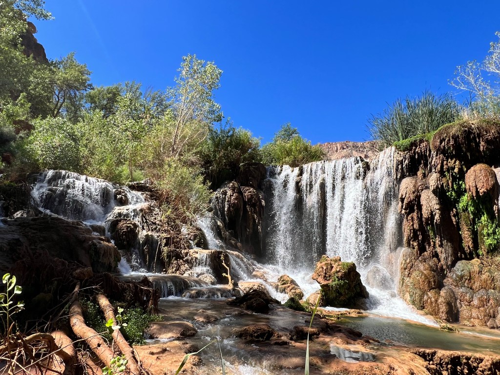 It was another morning of waking up between 4-5 am then relaxing a bit around camp before we got moving for the day! The early nights and time change made getting up early part of our normal routine! On our third day, we ventured into the canyon to discover the hidden gems of 50 Foot Falls and Navajo Falls. These stunning cascades offer a more secluded and tranquil experience as they aren’t heavily trafficked by all visitors. The hike to these falls takes you through the lush Havasupai landscape, with opportunities to take a refreshing dip in the creek’s pools.