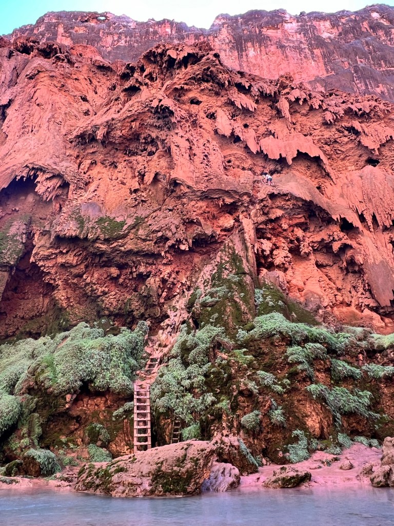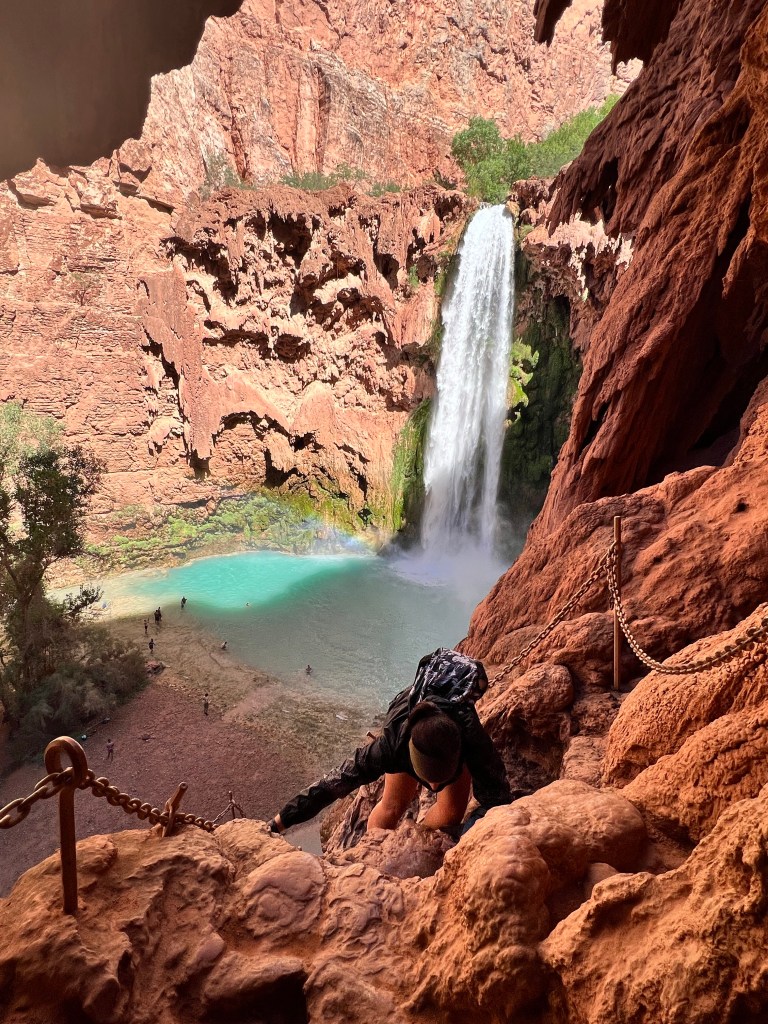 The adrenaline rush of descending to the base of the 200-foot falls is unmatched, and the view from below is truly spectacular. After navigating through a few caves in the rock face created by miners in the 20th century, we scaled the cliff face of chains and makeshift ladders down the 200 foot drop all while mist from neighboring Mooney Falls was pelting us in the face! I have never experienced anything like it and it is NOT a scenario you’d find in any National Park ha! It truly was an adventure in itself! The name of the falls actually got itself from Mr. Mooney who fell to his death a long time ago prior to the chains being in place.